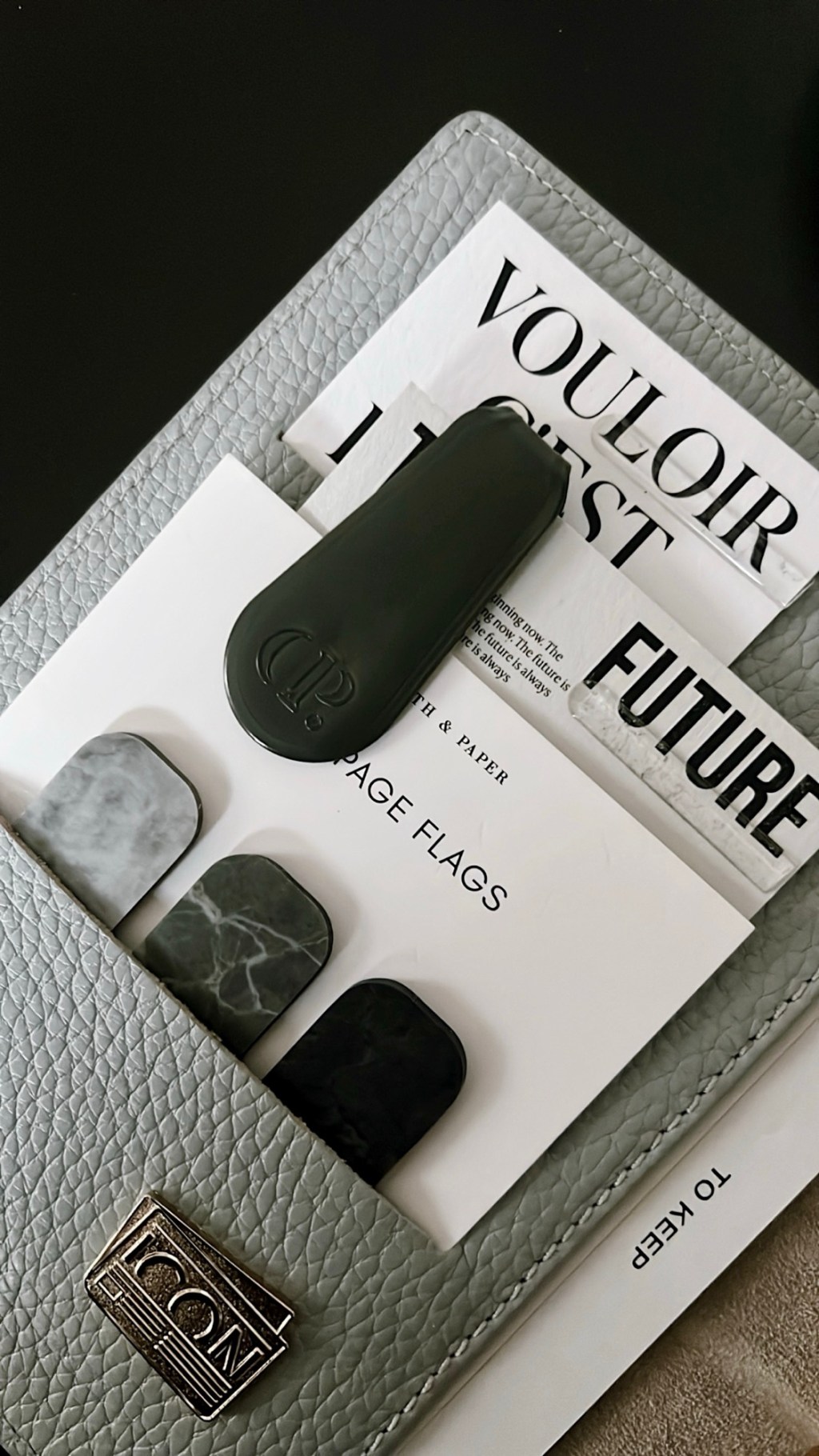 Some of my favs include the “to keep” envelopes which I use to hold small sticker sheets, the new GOLD BROOCH SET for a lil extra pizzazz, the stone luxe page flags which I love for deco moments, journal cards for motivation, my NORI CLIP thats holding my journal cards together, along with the DIAGONAL FOLDERS that I use to hold my most used stickers, the MINI OBLONG STICKY NOTES that I jot down any and everything from to do reminders to quotes on, and my RISTRETTO ECLIPSE CLIP which holds my stickers in my diagonal folders in place.