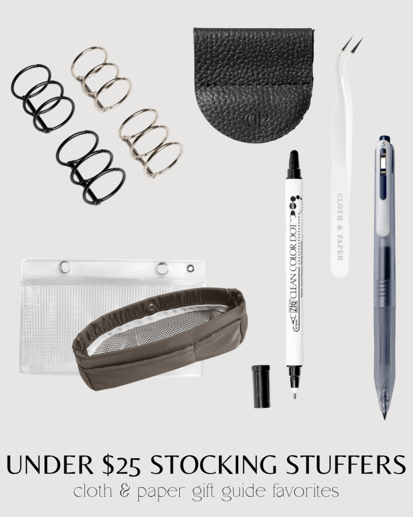 For my final collage I chose items perfect to use as stocking stuffers. These items include PLANNER RINGS, the ECLIPSE LEATHER BOOKMARK, the EVERYDAY CARRY POUCH & LINER , the ZIG DUAL DOT MARKER, classic C&P TWEEZERS, and the sleek ZEBRA CHILL PEN.