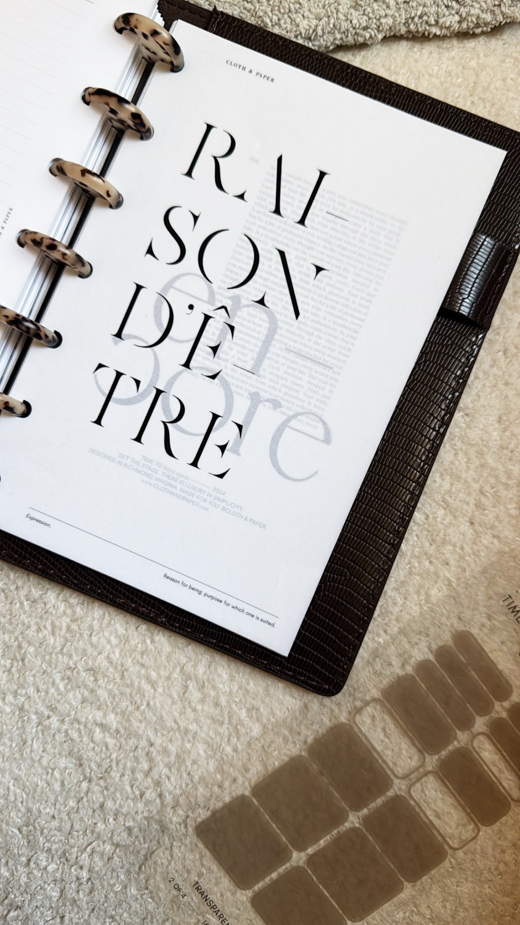 To start we have the CADENCE DASHBOARD paired with these DESERT TORTOISE COLORED DISCS , I’m using the 1in size. Also I have a MINI MAGNETIC CLIP, with the NARROW PAGE MARKERS in the same desert tortoise color scheme and the schedule and notes tabs from the ESSENTIAL SIDE TAB DIVIDERS set. For inserts I’m using THE UNDATED WEEKLY SCHEDULE INSERT and the GRAPH NOTES. Stickers mentioned are the SPOTLIGHT STICKERS in desert tortoise, DOT STICKERS in Ristretto, the TIMEBLOCK and ELLIPSE STICKERS both in the color Cortado. My current folio cover is no longer available but this WOVEN BROWN FOLIO is a great alternative.